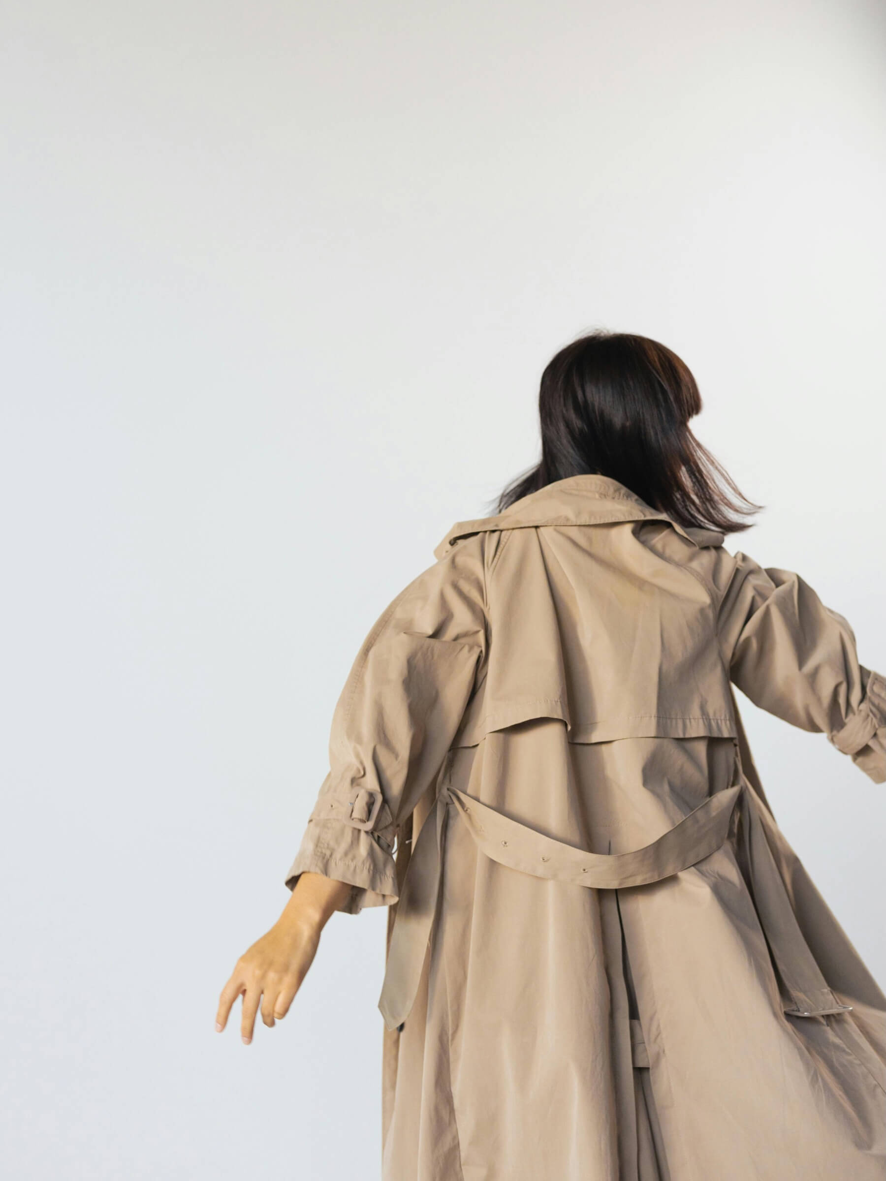 Straight Design. Wrap detail. Medium design. Lapel-collar. Long sleeve. Loops on the cuffs. Two side pockets. Button Fastening at the Front. Adjustable belt.
